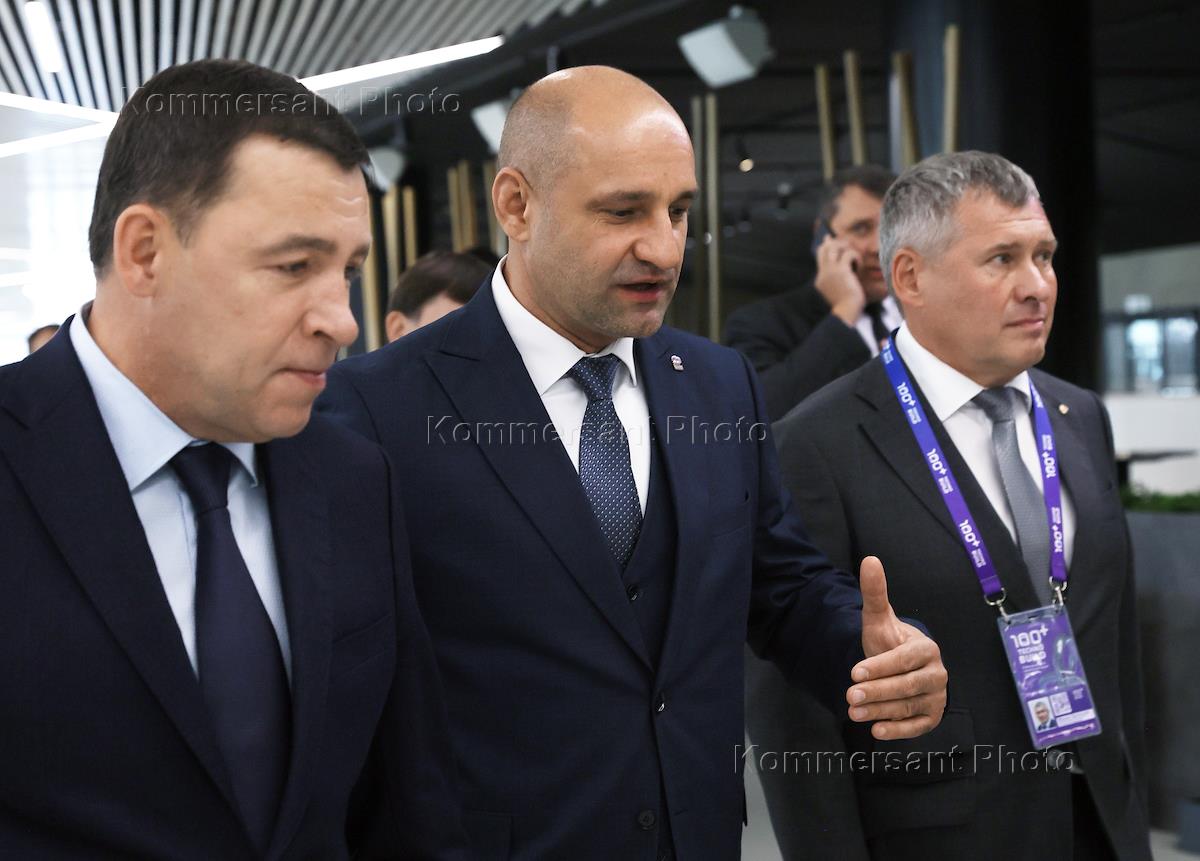 Международный строительный форум и выставка "100+ TechnoBuild" в МВЦ "Екатеринбург-ЭКСПО". Справа налево: главный федеральный инспектор по Свердловской области Михаил Богинский, полномочный представитель Президента России в Уральском федеральном округе Артем Жога и губернатор Свердловской области Евгений Куйвашев перед началом пленарного заседания "Строим мир будущего".