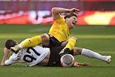 Фонбет - Кубок России по футболу 2024/25. Матч между командами "Химки" (Химки) - "Ростов" (Ростов-на-Дону) на стадионе "Арена Химки". Игрок команды "Ростов" Хорен Байрамян (слева) и игрок команды "Химки" Данил Степанов (слева) во время матча.