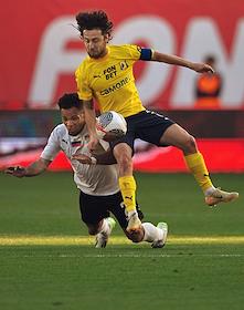 Фонбет - Кубок России по футболу 2024/25. Матч между командами "Химки" (Химки) - "Ростов" (Ростов-на-Дону) на стадионе "Арена Химки". Игрок команды "Ростов" Хорен Байрамян (справа) во время матча.