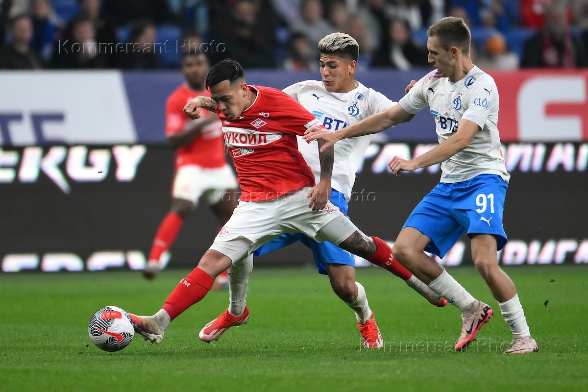 Фонбет - Кубок России по футболу 2024/25. Матч между командами "Динамо" (Москва) - "Спартак" (Москва) на стадионе "ВТБ Арена". Игрок команды "Динамо" Диего Лаксальт (справа) во время матча.