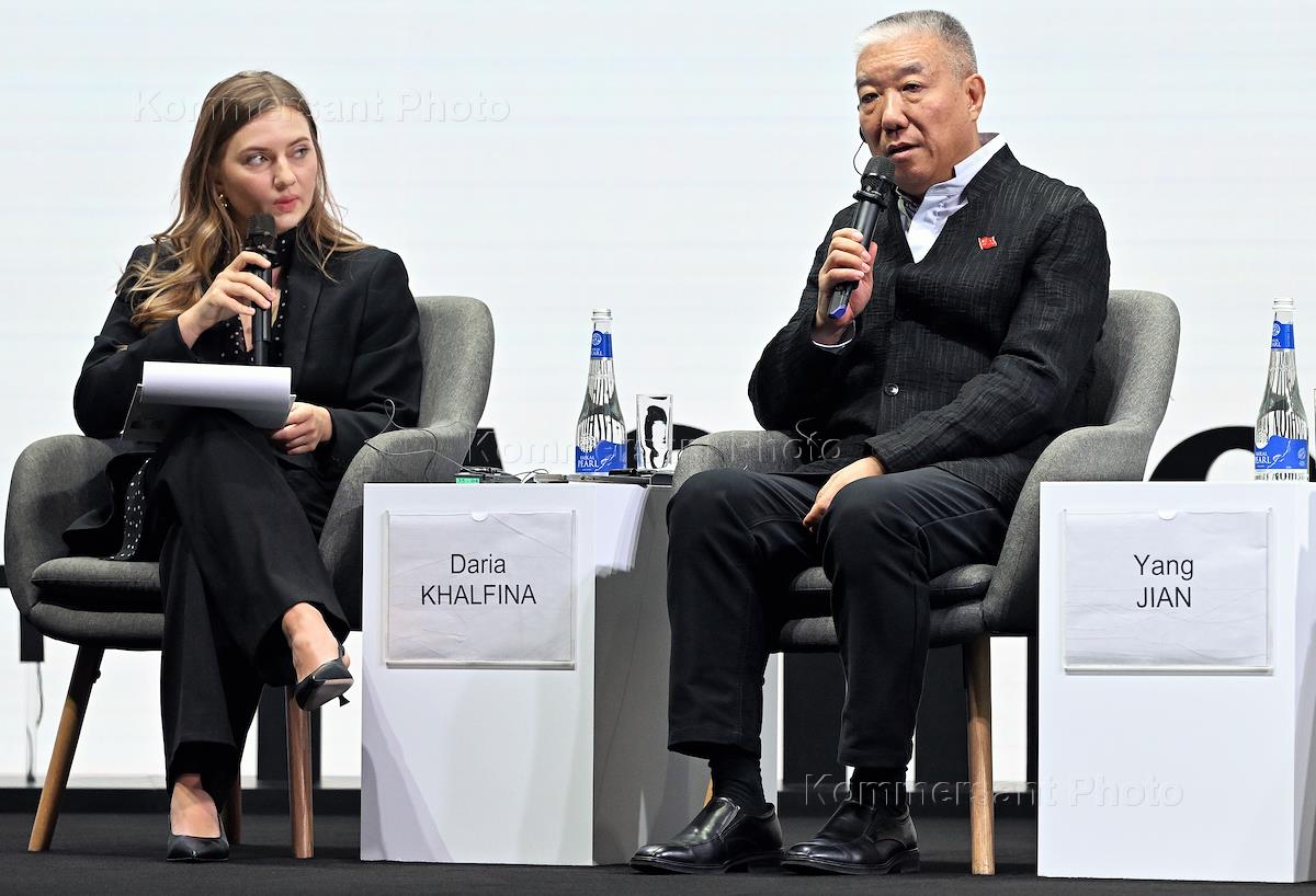 International forum BRICS+ Fashion Summit at the Moscow Concert Hall (MCH) "Zaryadye". Session "Global catwalk. Fashion weeks on all continents". Editor-in-Chief of Independent Media Daria Halfina (left) and Executive Chairman of the Chinese Fashion Association (CHINA FASHION ASSOCIATION) and Chairman of the Organizing Committee of China Fashion Week Yang Jian (right) during the session.