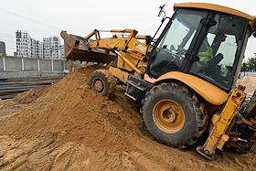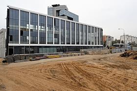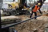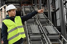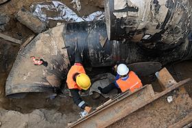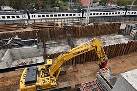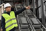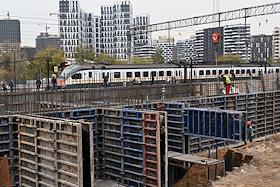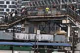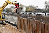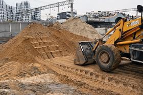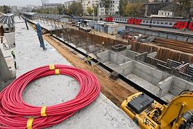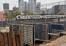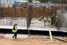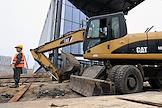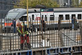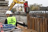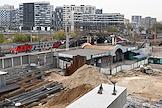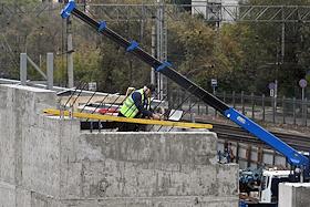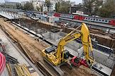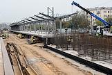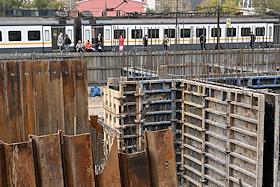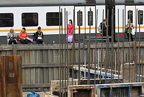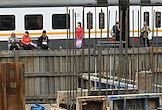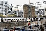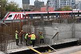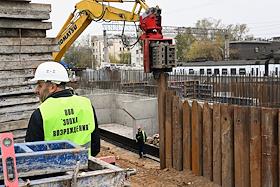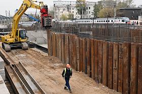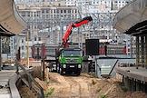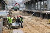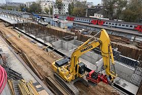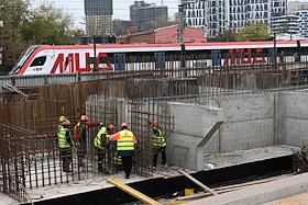 Строительство нового московского городского вокзала "Серп и Молот". Жанровая фотография. Рабочие в защитных светоотражающих жилетах на территории стройки.