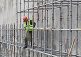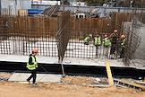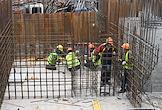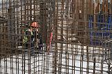 Строительство нового московского городского вокзала "Серп и Молот". Жанровая фотография. Рабочие во время вязки арматуры для залива бетоном стен здания вокзала.