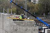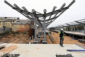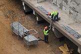 Строительство нового московского городского вокзала "Серп и Молот". Жанровая фотография. Рабочие во время сборки защитного козырька над перроном станции.