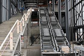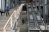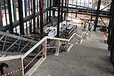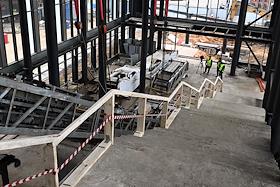 Строительство нового московского городского вокзала "Серп и Молот". Жанровая фотография. Вестибюль здания вокзала. Монтировка лестничного пространства и эскалатора здания.