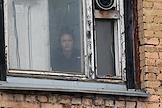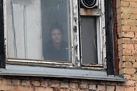 Строительство нового московского городского вокзала "Серп и Молот". Жанровая фотография. Женщина смотрит в окно на строительство здания.