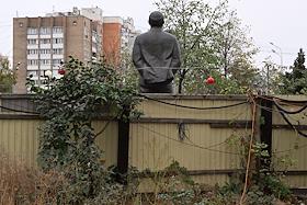 Строительство нового московского городского вокзала "Серп и Молот". Жанровая фотография. Памятник вождю революции Владимиру Ленину за забором территории станции.
