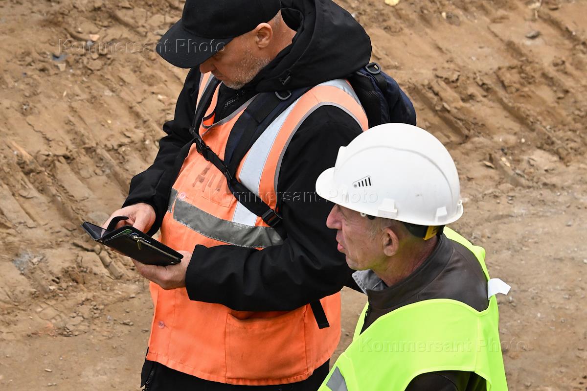 Строительство нового московского городского вокзала "Серп и Молот". Жанровая фотография. Рабочие в защитных светоотражающих жилетах на территории стройки.