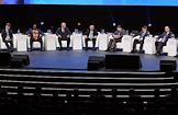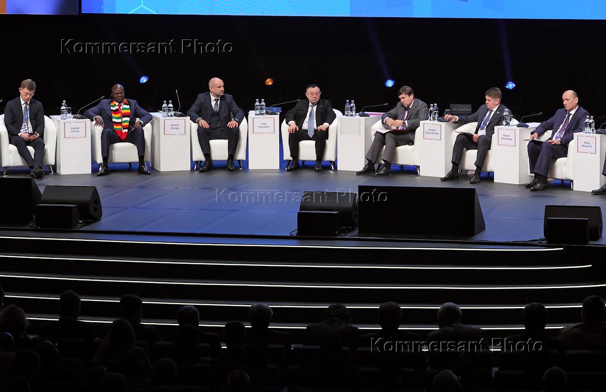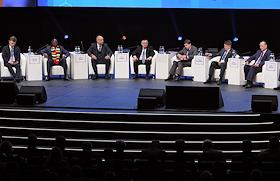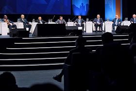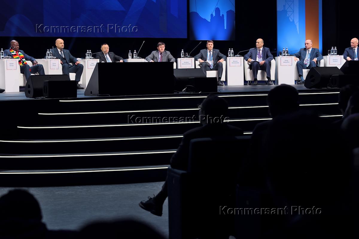 Международный строительный форум и выставка "100+ TechnoBuild" в МВЦ "Екатеринбург-ЭКСПО". Пленарное заседание "Строим мир будущего". Участники во время заседания.