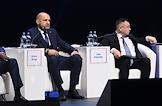Международный строительный форум и выставка "100+ TechnoBuild" в МВЦ "Екатеринбург-ЭКСПО". Пленарное заседание "Строим мир будущего". Полномочный представитель Президента России в Уральском федеральном округе Артем Жога (слева) и министр строительства и жилищно-коммунального хозяйства России Ирек Файзуллин (справа) во время заседания.