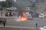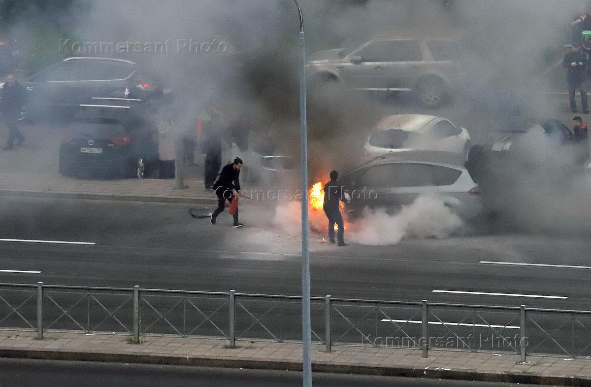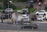 Возгорание моторного отсека легкового автомобиля на Богатырском проспекте напротив дома 32 корпус 1. Сотрудники Государственной противопожарной службы МЧС России и очевидцы во время ликвидации возгорания.