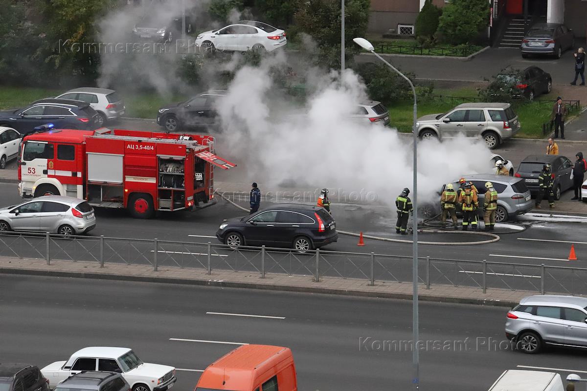 Возгорание моторного отсека легкового автомобиля на Богатырском проспекте напротив дома 32 корпус 1. Сотрудники Государственной противопожарной службы МЧС России и очевидцы во время ликвидации возгорания.