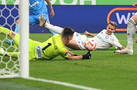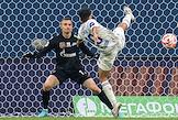World Russian Premier League (RPL) 2024/2025. 11th round. Match between the teams "Zenit" (St. Petersburg) - "Orenburg" (Orenburg) at the Gazprom Arena stadium. Zenit team goalkeeper Evgeny Latyshonok (left) and Orenburg team player Said Sakharkhizan (right) during the match.