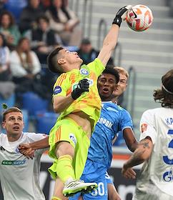 World Russian Premier League (RPL) 2024/2025. 11th round. Match between the teams "Zenit" (St. Petersburg) - "Orenburg" (Orenburg) at the Gazprom Arena stadium. Goalkeeper of the Orenburg team Bogdan Moskvichev (left) during the match.
