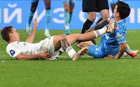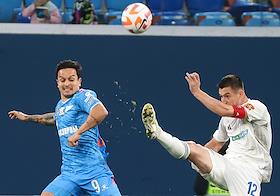 World Russian Premier League (RPL) 2024/2025. 11th round. Match between the teams "Zenit" (St. Petersburg) - "Orenburg" (Orenburg) at the Gazprom Arena stadium. Zenit team player Arthur (left) and Orenburg team player Andrei Malykh (right) during the match.