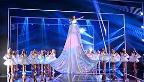Финал национального конкурса "Мисс Россия" в концертном зале "Барвиха Luxury Village". Фотомодель, обладательница титула "Мисс Россия 2023" Маргарита Голубева (в центре) во время выступления с песней "Улетай на крыльях ветра".