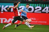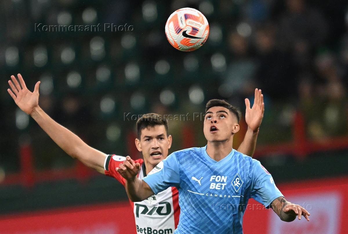Мир Российская Премьер-Лига (РПЛ) 2024/2025. 11-й тур. Матч между командами "Локомотив" (Москва) - "Крылья Советов" (Самара) на стадионе "РЖД Арена". Игрок команды "Крылья Советов" Иван Олейников (слева) во время матча.