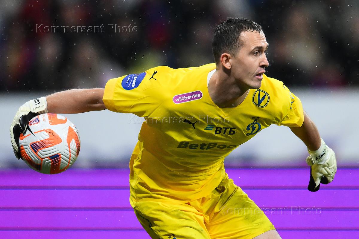 Мир Российская Премьер-Лига (РПЛ) 2024/2025. 11-й тур. Матч между командами "Динамо" (Москва) - ЦСКА (Москва) на стадионе "ВТБ Арена - Центральный стадион Динамо им. Льва Яшина". Вратарь команды "Динамо" Андрей Лунев во время матча.