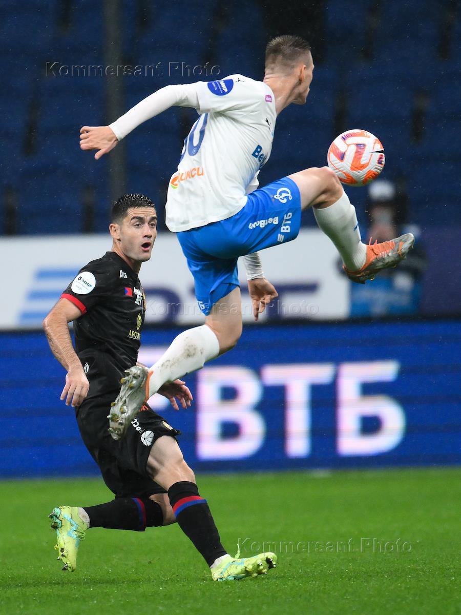 Мир Российская Премьер-Лига (РПЛ) 2024/2025. 11-й тур. Матч между командами "Динамо" (Москва) - ЦСКА (Москва) на стадионе "ВТБ Арена - Центральный стадион Динамо им. Льва Яшина". Игрок команды ЦСКА Игорь Дивеев (справа) во время матча.