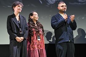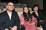 Фестиваль актуального российского кино "Маяк" в Геленджике. Показ конкурсного фильма "Папа умер в субботу". Слева направо, участники съемочной группы фильма: актриса Лаура Турсунканова, продюсер Наталья Дрозд и режиссер Зака Абдрахманова перед началом показа.