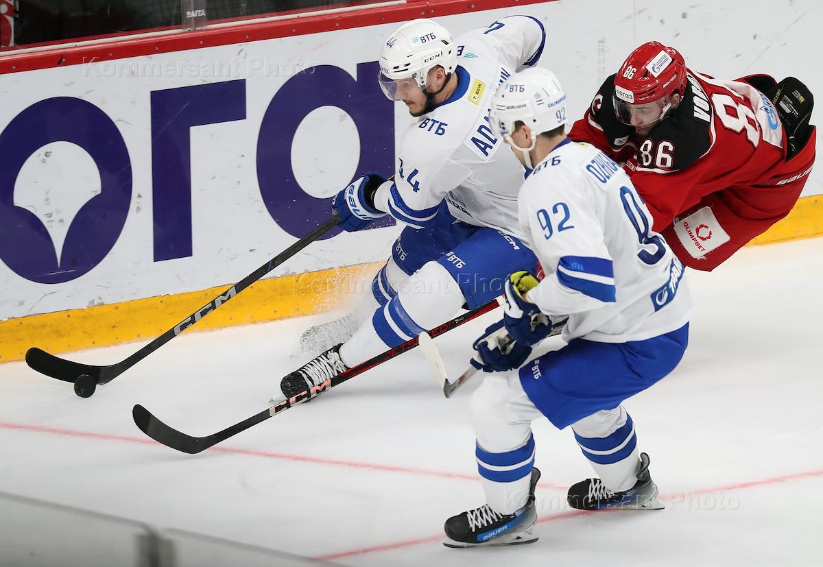 Континентальная Хоккейная Лига (КХЛ). Матч между командами "Витязь" (Московская область, Балашиха) - "Динамо" (Москва) в Ледовом Дворце "Арена "Балашиха" им. Ю.Е. Ляпкина. Игроки команды "Динамо" Игорь Ожиганов (в центре), Кирилл Адамчук (слева) и игрок команды "Витязь" Иван Воробьев (справа) во время матча.