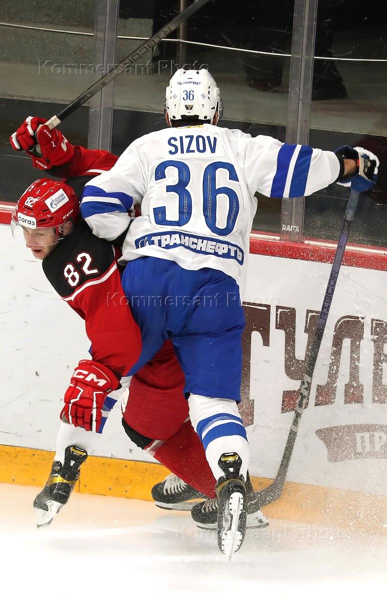 Континентальная Хоккейная Лига (КХЛ). Матч между командами "Витязь" (Московская область, Балашиха) - "Динамо" (Москва) в Ледовом Дворце "Арена "Балашиха" им. Ю.Е. Ляпкина. Игрок команды "Динамо" Антон Сизов (справа) и игрок команды "Витязь" Иван Чехович (слева) во время матча.
