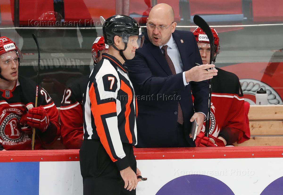 Континентальная Хоккейная Лига (КХЛ). Матч между командами "Витязь" (Московская область, Балашиха) - "Динамо" (Москва) в Ледовом Дворце "Арена "Балашиха" им. Ю.Е. Ляпкина. Главный тренер команды "Витязь" Павел Десятков (справа) во время матча.