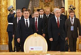 Саммит лидеров стран СНГ в Большом Кремлевском дворце. Слева направо: премьер-министр Армении Никол Пашинян, президент Белоруссии Александр Лукашенко, президент Казахстана Касым-Жомарт Токаев, президент России Владимир Путин, президент Киргизии Садыр Жапаров и президент Таджикистана Эмомали Рахмон после церемонии совместного фотографирования.