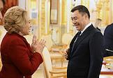 Саммит лидеров стран СНГ в Большом Кремлевском дворце. Председатель Совета Федерации России Валентина Матвиенко (слева) и президент Киргизии Садыр Жапаров (справа) перед началом саммита.