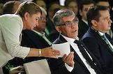 Российский экологический форум (РЭФ) на площадке СберУниверститета в деревне Аносино. Пленарное заседание "Пять лет будущего: фокус на экологию и "зеленые" инвестиции". Председатель ПАО "Промсвязьбанк" Петр Фрадков во время заседания.