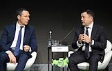 Российский экологический форум (РЭФ) на площадке СберУниверститета в деревне Аносино. Пленарное заседание "Пять лет будущего: фокус на экологию и "зеленые" инвестиции". Генеральный директор ППК "РЭО", администратор федерального проекта "Комплексная система обращения с твердыми коммунальными отходами" Денис Буцаев (слева) и председатель ПАО "Промсвязьбанк" Петр Фрадков (справа) во время заседания.