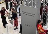 Третья Московская неделя моды в ЦВЗ "Манеж". Жанровая фотография. Зрители во время посещения шоу-рума с моделями одежды.