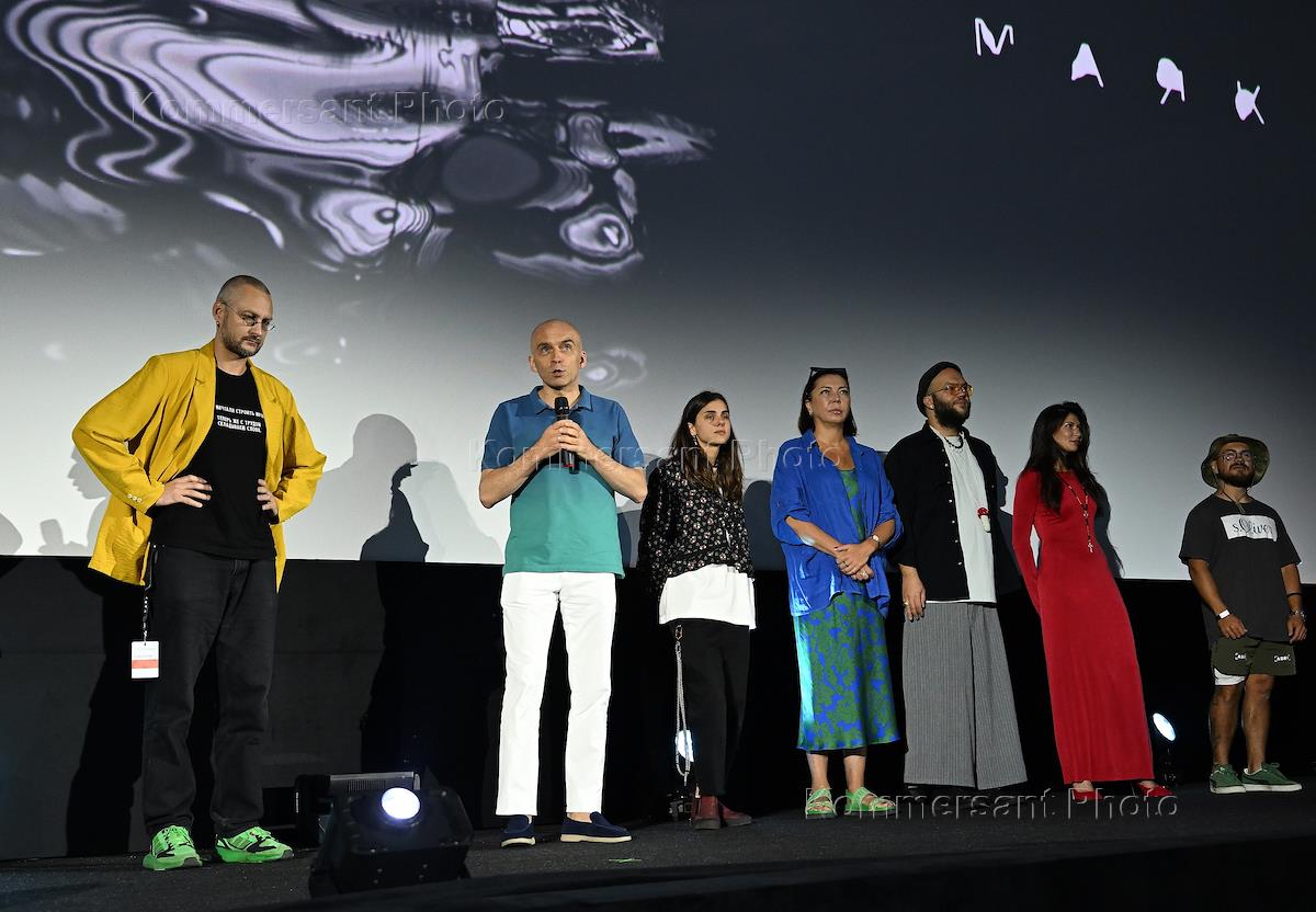 Фестиваль актуального российского кино "Маяк". Показ фильма режиссера Александра Ханта "Джекпот". Режиссер Александр Хант (слева), продюсер Максим Дашкин, оператор Даниил Фомичев (третий справа) и художник Руслана Османова (вторая справа) перед началом показа.