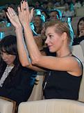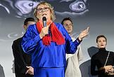 Фестиваль актуального российского кино "Маяк". Показ фильма режиссера Ильи Хотиненко "Кинопленка №8". Продюсер Юлия Мишкинене (в центре) во время выступления перед началом показа.