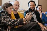 Фестиваль актуального российского кино "Маяк". Показ фильма Александра Ханта "Джекпот". Оператор Даниил Фомичев (слева), режиссер Александр Хант (второй слева) и художник Руслана Османова (вторая справа) перед началом показа.