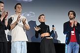 Фестиваль актуального российского кино "Маяк". Показ фильма режиссера Ильи Хотиненко "Кинопленка №8". Слева направо, съемочная группа фильма: актер Семен Литвинов, оператор Кирилл Герра, актеры Кристина Асмус и Александр Варлей перед началом показа.