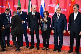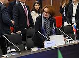 Заключительная встреча министров финансов и управляющих центральными банками стран БРИКС с участием представителей новых стран-членов объединения в "Лотте Отеле". Председатель Центрального Банка России Эльвира Набиуллина (в центре) во время встречи.