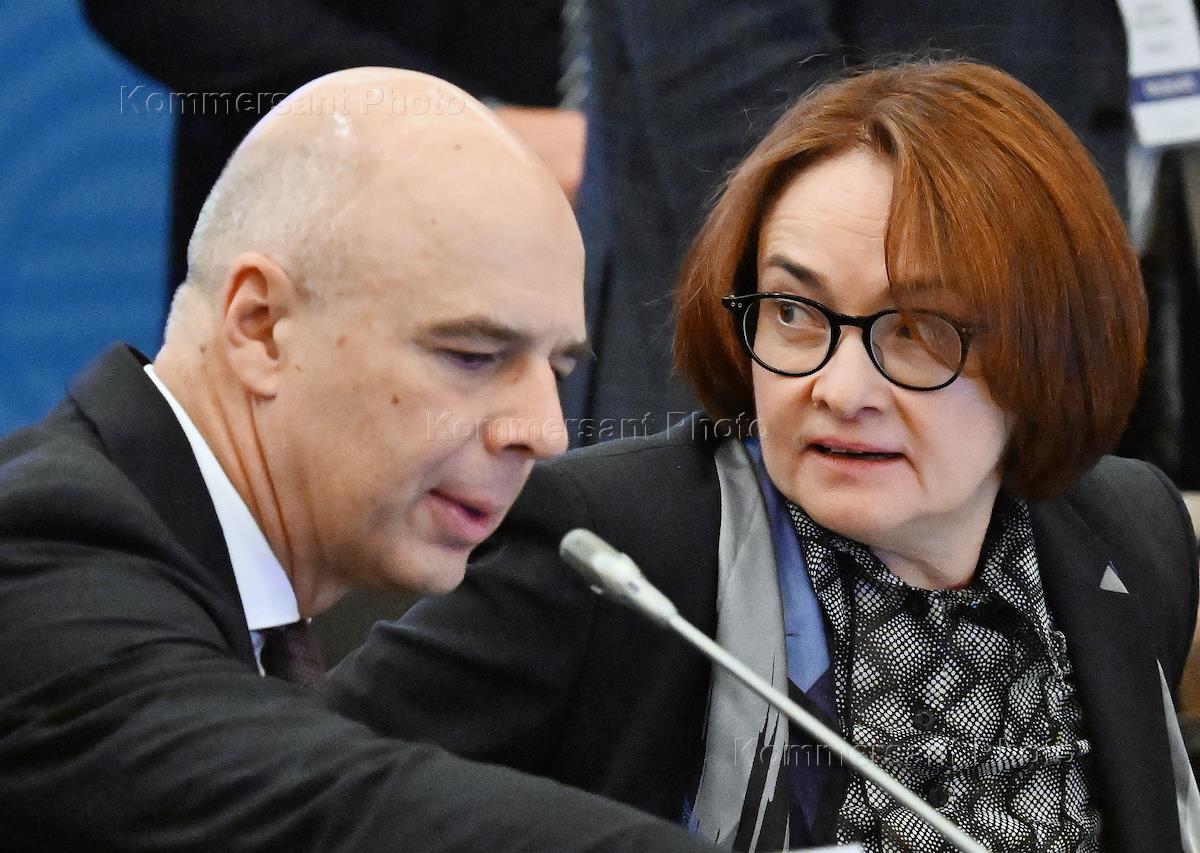 Заключительная встреча министров финансов и управляющих центральными банками стран БРИКС с участием представителей новых стран-членов объединения в "Лотте Отеле". Председатель Центрального Банка России Эльвира Набиуллина (справа) и министр финансов России Антон Силуанов (слева) во время встречи.