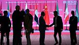Заключительная встреча министров финансов и управляющих центральными банками стран БРИКС с участием представителей новых стран-членов объединения в "Лотте Отеле". Жанровая фотография. Силуэты участников встречи.