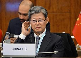 Заключительная встреча министров финансов и управляющих центральными банками стран БРИКС с участием представителей новых стран-членов объединения в "Лотте Отеле". Председатель Народного банка Китая Сюань Чаннэн во время встречи.