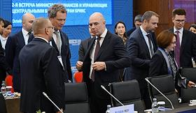 Заключительная встреча министров финансов и управляющих центральными банками стран БРИКС с участием представителей новых стран-членов объединения в "Лотте Отеле". Министр финансов России Антон Силуанов (в центре) во время встречи.