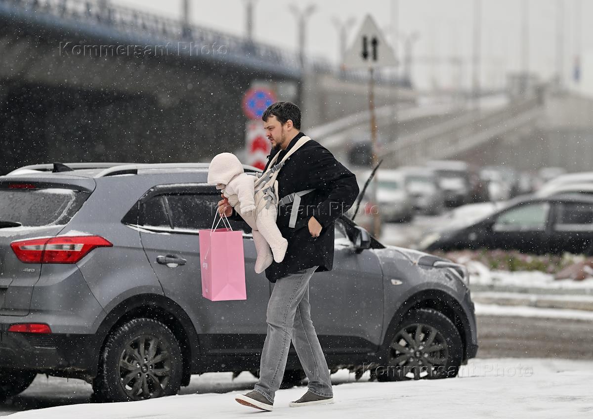 Первый снег в Омске. Жанровая фотография. Мужчина с ребенком у автомобиля.