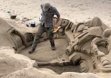 Виды Лондона. Жанровая фотография. Мужчина на набережной реки Темза делает из песка скульптурную композицию.