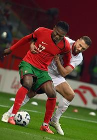 Лига наций УЕФА. Матч по футболу между сборными Польши и Португалии на Национальном стадионе. Игрок сборной Португалии Рафаэл Леау (слева) во время матча.