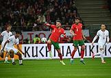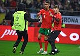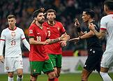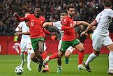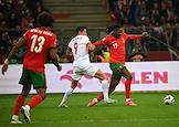 Лига наций УЕФА. Матч по футболу между сборными Польши и Португалии на Национальном стадионе. Игрок сборной Португалии Бернау Фернандеш (в центре) и игрок сборной Польши Якуб Модер (справа) во время матча.