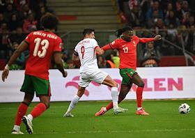 Лига наций УЕФА. Матч по футболу между сборными Польши и Португалии на Национальном стадионе. Игрок сборной Португалии Рафаэл Леау (справа) и игрок сборной Польши Роберт Левандовски (в центре) во время матча.