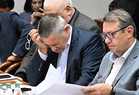 Заседание комитета Государственной думы (ГД) по бюджету и налогам в здании ГД России. Первый заместитель председателя комитета ГД России по бюджету и налогам Глеб Хор (в центре) и член комитета ГД России по бюджету и налогам Валерий Скруг (справа) во время заседания.