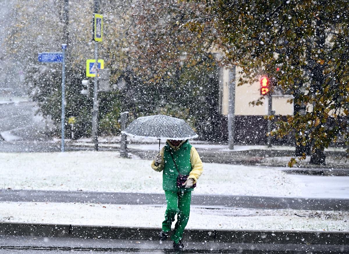 Снегопад в Москве. Жанровая фотография. Пожилая женщина под зонтом на улице во время снегопада.