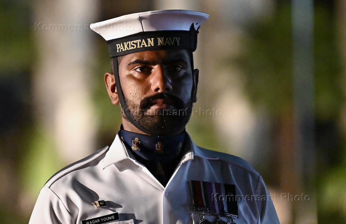 Рабочая поездка председателя правительства России Михаила Мишустина в Пакистан. Жанровая фотография. Военнослужащий роты Почетного караула во время церемонии встречи на авиабазе ВВС Пакистана "Нур Хан".