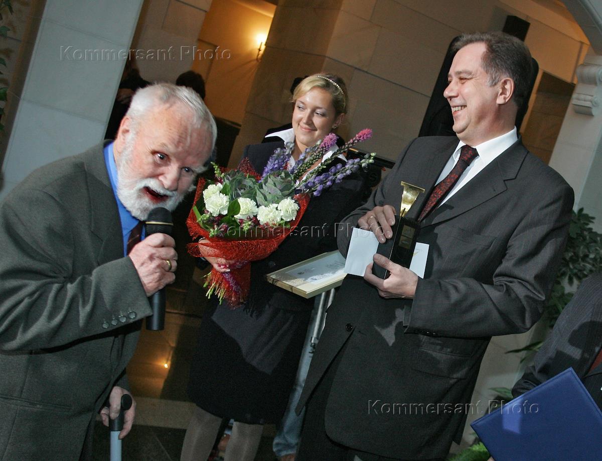 Писатель Василий Белов (слева) и министр культуры и массовых коммуникаций России Александр Соколов (справа) во время торжественной церемонии, посвященной вручению ежегодной литературной премии "Ясная Поляна" имени писателя Льва Толстого за 2006 год. Церемония прошла в зале "Атриум" вспомогательного корпуса Большого театра. Василий Белов стал лауреатом премии "Ясная Поляна".